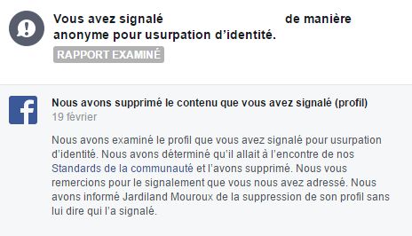 Vous avez signalé *** de manière anonyme pour usurpation d’identité. Notre réponse : Nous avons supprimé le contenu que vous avez signalé (profil)